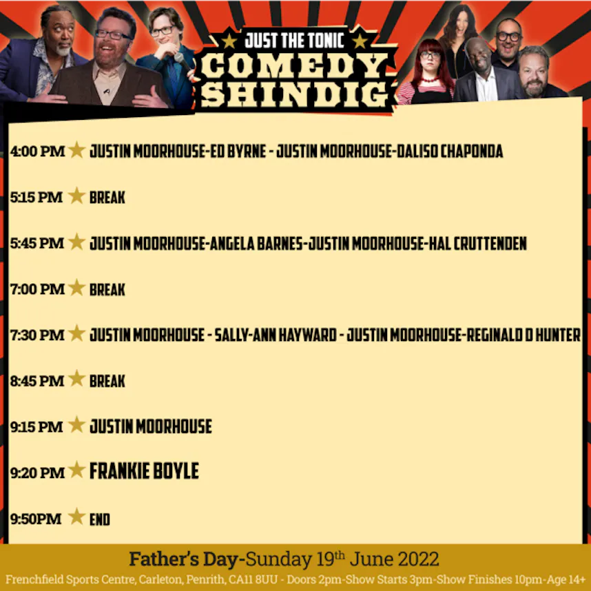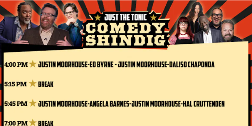 What are the timings for Just The Tonic Comedy Shindig?