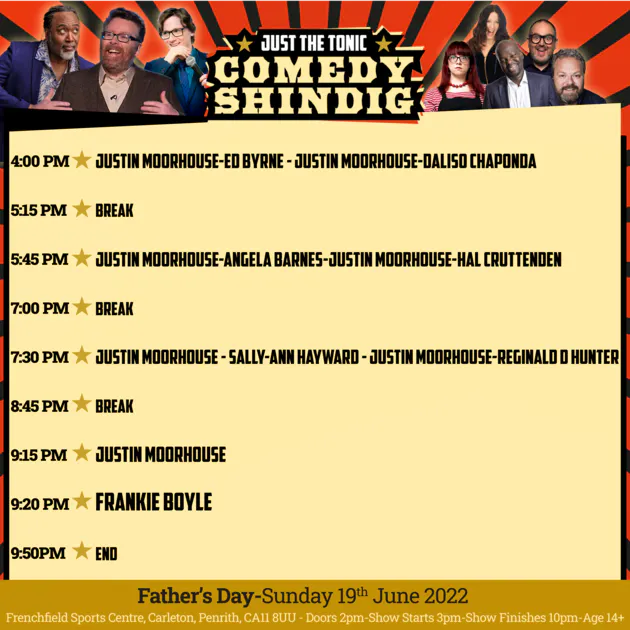 What are the timings for Just The Tonic Comedy Shindig?