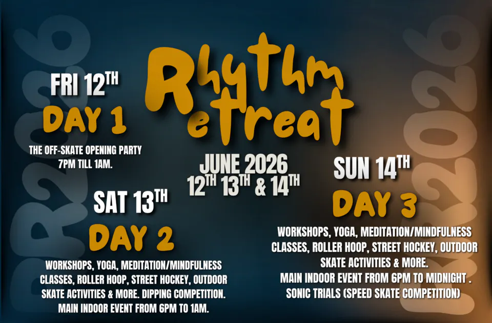 By entering this Rhythm Retreat event you agree to adhere to our rules and follow the instruction of the staff. Failure to abide by the skate steward's or other staff's instructions shall leave you liable to eviction.