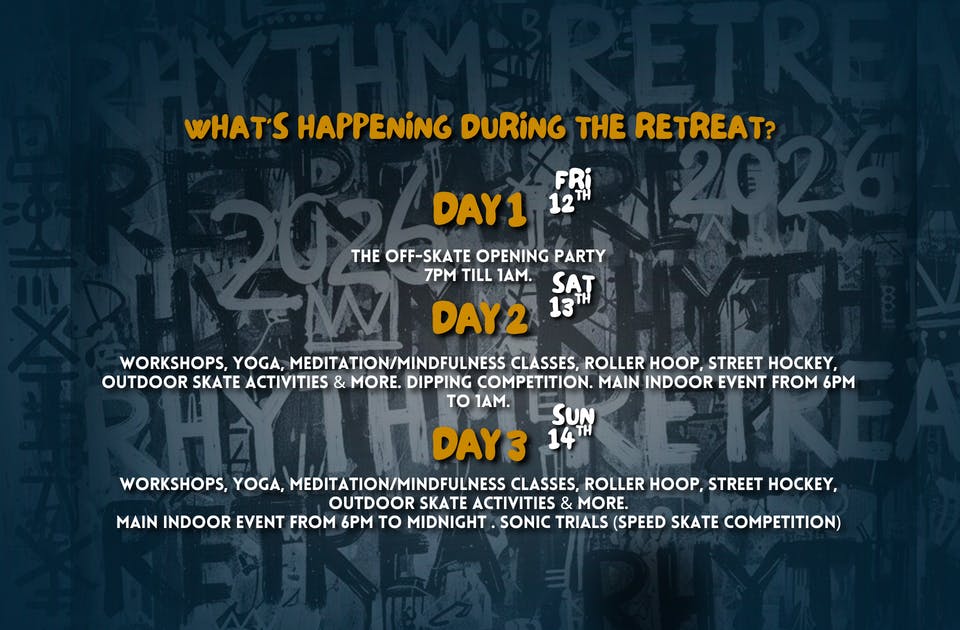 By entering this Rhythm Retreat event you agree to adhere to our rules and follow the instruction of the staff. Failure to abide by the skate steward's or other staff's instructions shall leave you liable to eviction.