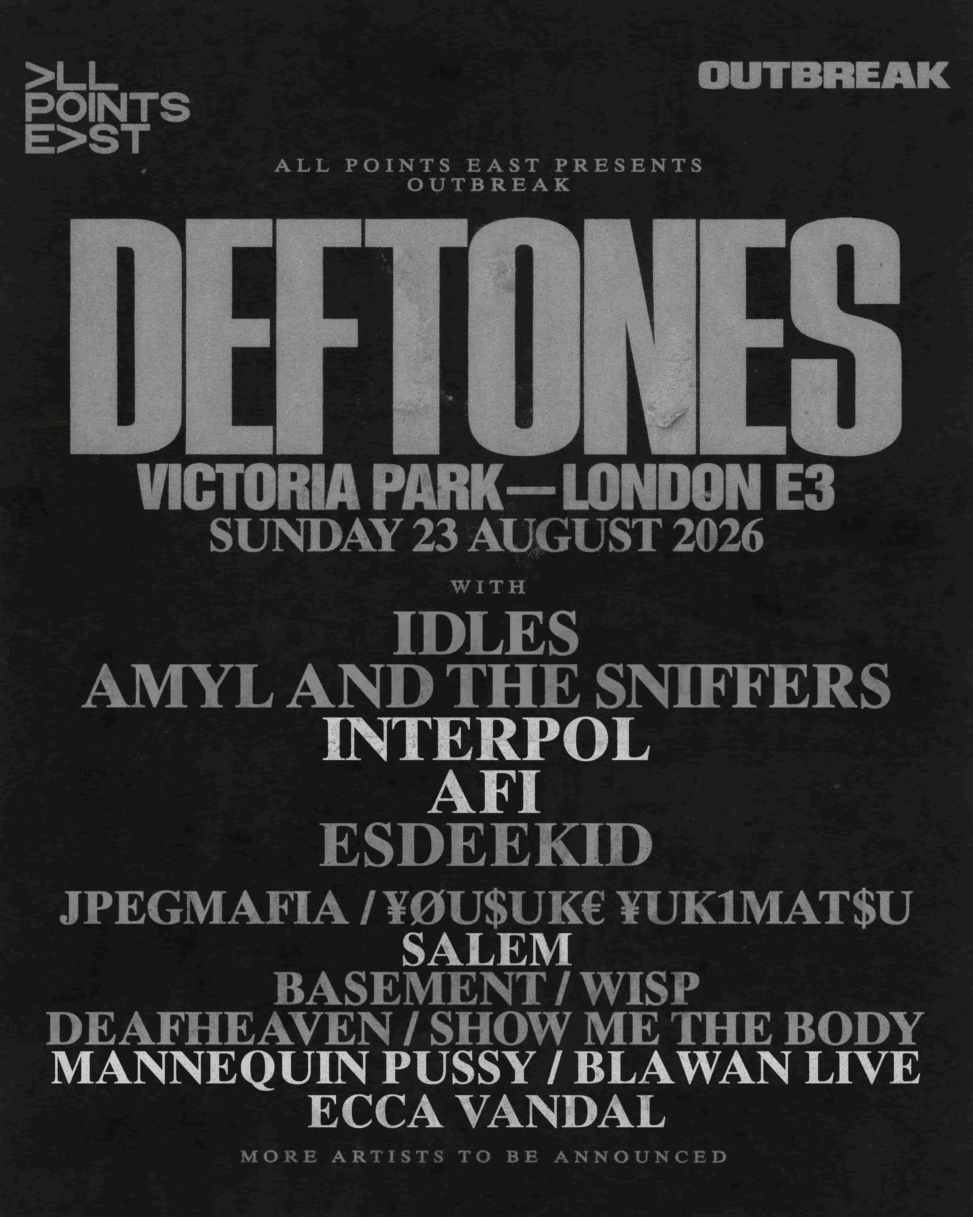 A slew of special guests are joining Deftones at this year’s All Points East and Outbreak Festival crossover in London. The alt-metal band will be joined by Interpol, AFI, Salem, Mannequin Pussy, Blawan and Ecca Vandal.