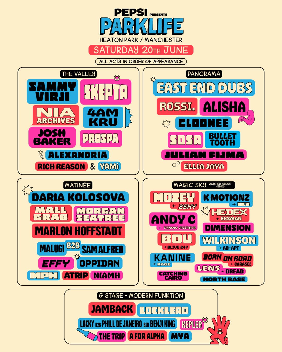 The summer festival, presented by Pepsi MAX, officially dropped the first full wave of artists in January, and today have confirmed who’s playing over the two days. Saturday 20th June sees Sammy Virji headline The Valley stage, alongside Skepta, Nia Archives, 4am Kru, Josh Baker, and Prospa; East End Dubs will head up the Panorama scene in addition to Rossi., Alisha, and Cloonee; Daria Kolosova, Mall Grab, and Morgan Seatree are taking to the Matinée stage; Worried About Henry's Magic Sky stage features a slate of B2B bangers, including Mozey & 2Shy and Hedex & Eksman; and Modern Funktion take over the G Stage.