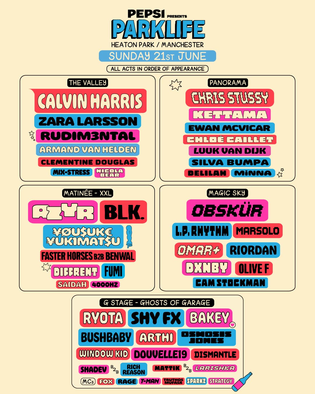Keeping things moving onto Sunday 21st June are Calvin Harris, Zara Larsson, and Rudimental at The Valley; Panorama will welcome Chris Stussy, Kettama, and Ewan McVicar; XXL takes over the Matinée stage and will host Azyr, blk., and ¥ØU$UK€ ¥UK1MAT$U; Obskür and L.P. Rhythm head up Magic Sky; and Ghosts of Garage take their turn on the G Stage.