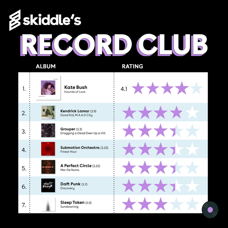 Last week, Tom from Account Support brought Sleep Token - Sundowning to the Record Club, and though it didn't win fans in all corners of Skiddle, it managed to take 6th place on our leaderboard, just behind Daft Punk, pushing Swans to 7th position. Sleep Token was an interesting one that was very divisive for our listeners. The moshers of the group wanted more METAL than was on offer, while others enjoyed the poppy elements and the balance between the two: "Brilliantly atmospheric. I liked how tracks often started with lovely reverb-y vocals paired nicely with calm piano/guitar to then finish on something more powerful." However, others were put off by the singers' affected vocal style, highly reminiscent of chart-pop acts: "The vocals make me feel really queezy. It's like Bastille, except they have "heavy" bits," viewing the "heavy" elements as some kind of novelty. It did earn a high re-listen score, however! 70% of our listeners would listen again. One even gave it a 4.5/5! That's our joint highest individual score yet! Read all about the album that had one listener saying "The band have a confusing sound as it sounds like rock in some parts but then gets very poppy and sounded like a different band!" HERE!