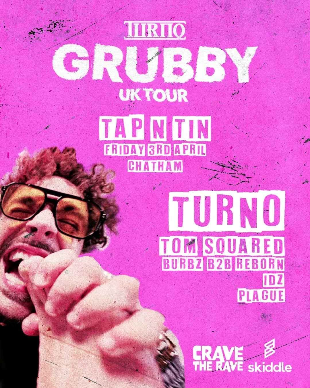 Drum and bass heavyweight TURNO brings his GRUBBY tour to Tap N Tin for a high-energy Easter rave that would leave even the Easter bunny lcoked in a skank. Expect all we've come to know and love from the jump-up master, heavy drops, fast-paced beats, and a packed dancefloor as Crave The Rave delivers another unforgettable night. Support from Tom Squared, Burbz b2b Reborn, and Plague
