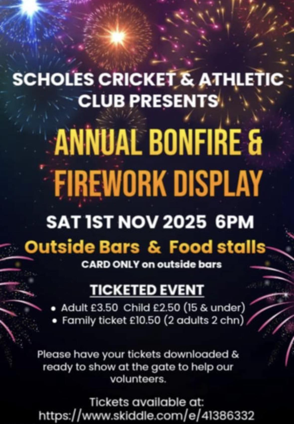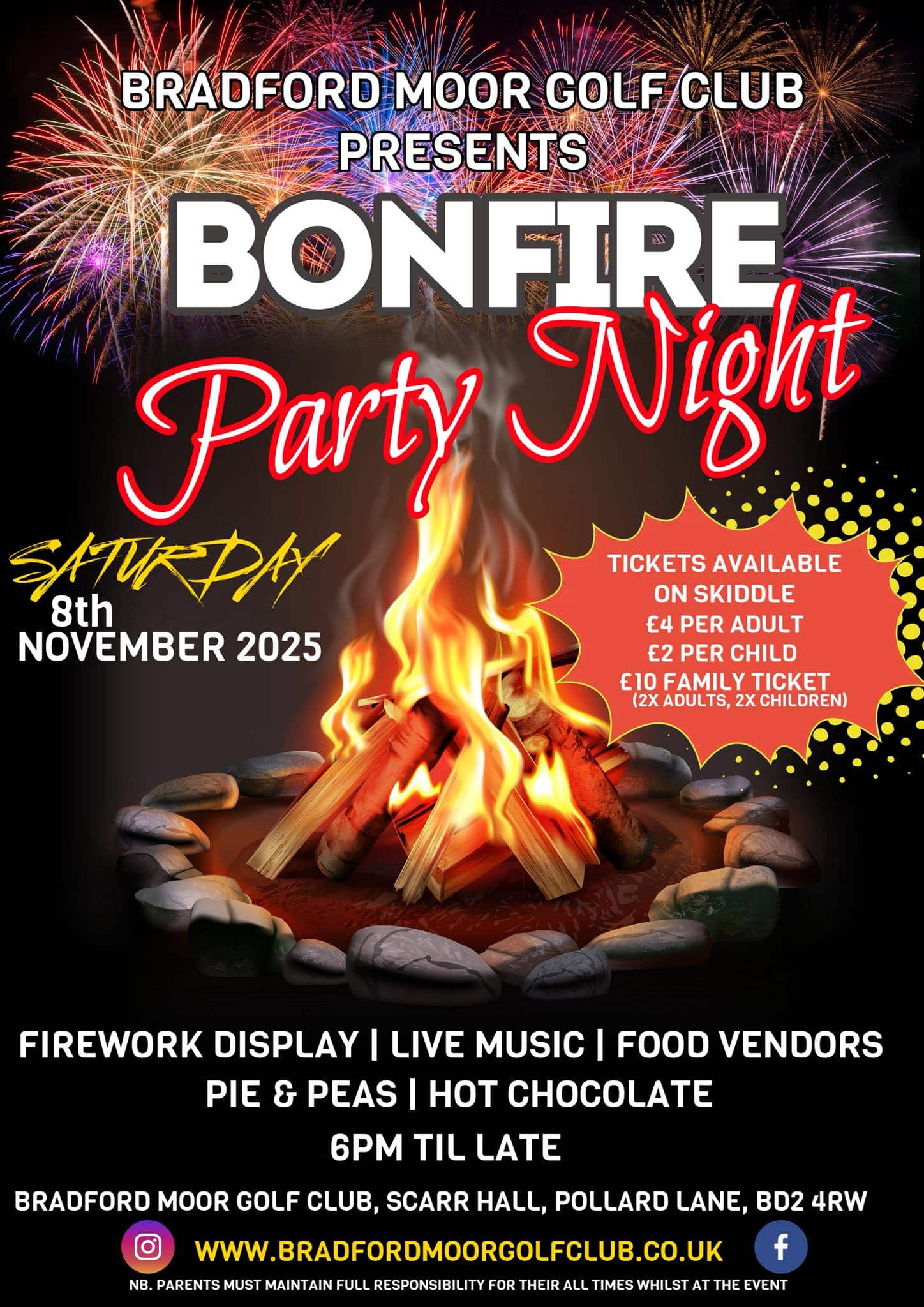 Woodlands CC’s Bonfire & Firework Night is back, lighting up the Bradford skyline once again. Families can enjoy an evening of traditional bonfire fun, complete with delicious hot food, toasty drinks, and a thrilling fireworks display that promises to wow all ages.