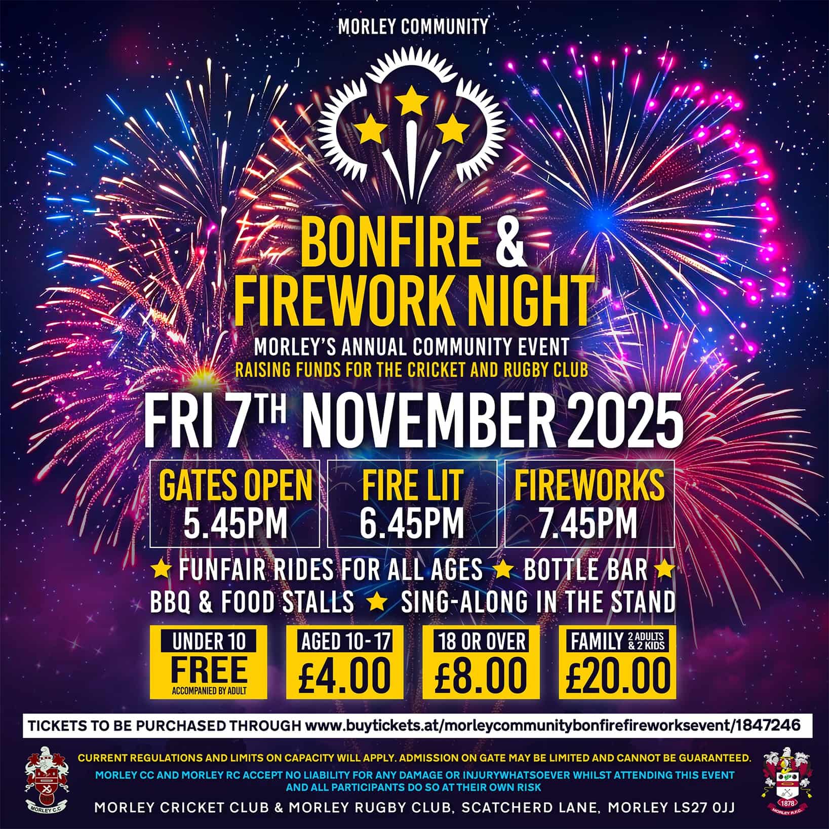 Morley’s massive community bonfire spans two club grounds and includes rides, stalls, music, and loads of food vendors. It’s one of the biggest displays in South Leeds and always draws a huge crowd — gates open from 5:45pm.