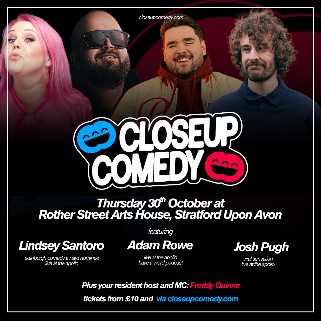 Closeup Comedy brings four of the UK’s best-loved live acts to Shakespeare country. Adam Rowe and Josh Pugh deliver their powerhouse sets, with Lindsay Santoro bringing that Midlands charm, and Freddy Quinne bringing his signature darkness as host. Top class comedy in an intimate & beautiful 400 seater theatre with all the Closeup energy you know and love.