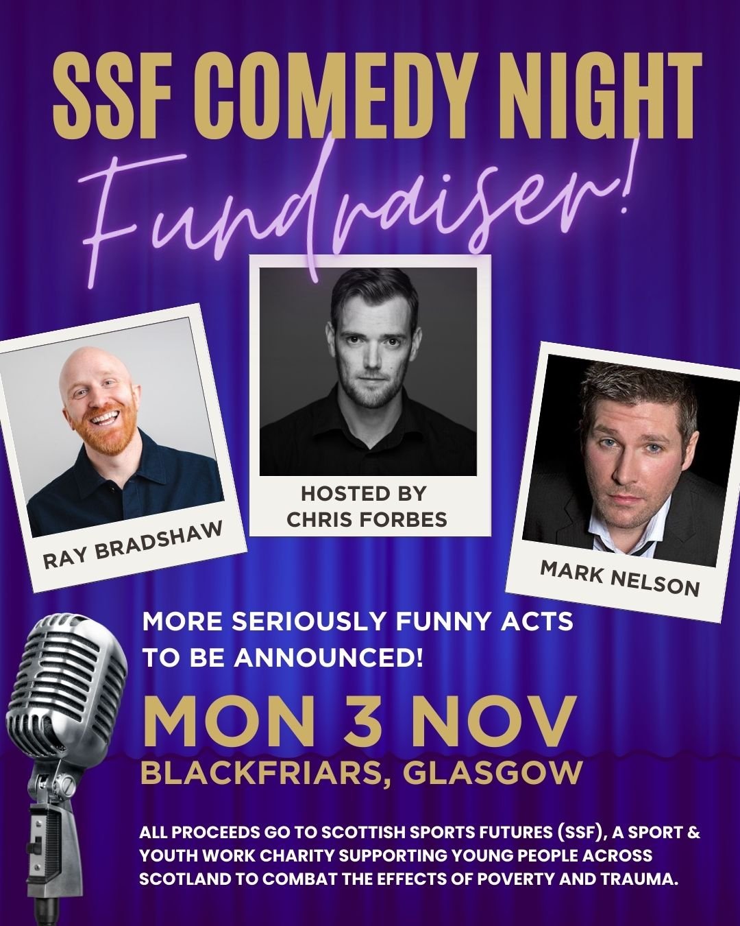 A cracking night for a brilliant cause. Hosted by Scot Squad favourite Chris Forbes, with heavy‑hitters Mark Nelson and Ray Bradshaw in support, this fundraiser backs Scottish Sports Futures, a charity using sport to help young people build healthier, more confident lives.