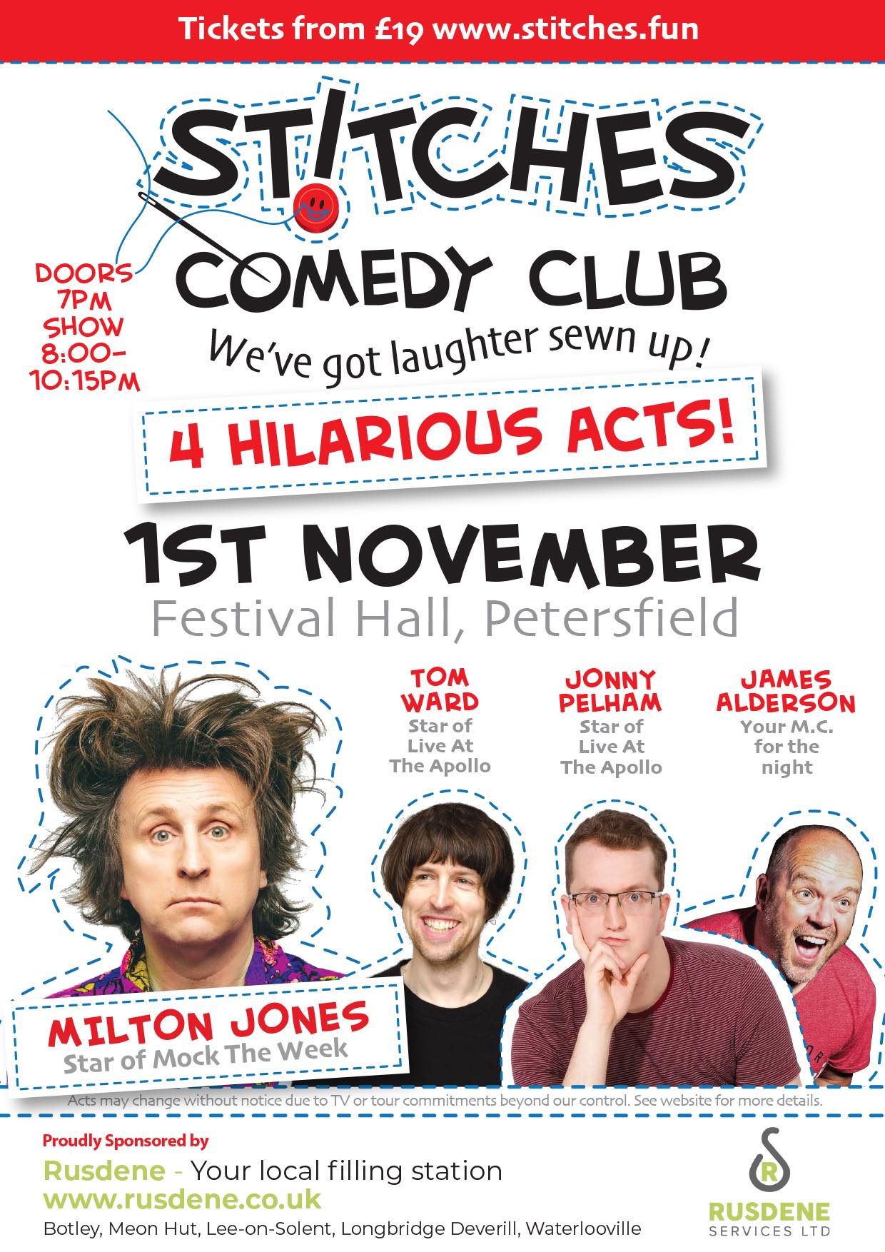 “Voted best comedy club in London & the South East,” Stitches returns with a November blockbuster: Milton Jones headlines—yes, the master of surreal one‑liners from Mock The Week and Live at the Apollo. He’s joined by top‑tier supports Tom Ward and Jonny Pelham, with award‑winning compère James Alderson steering the ship.
