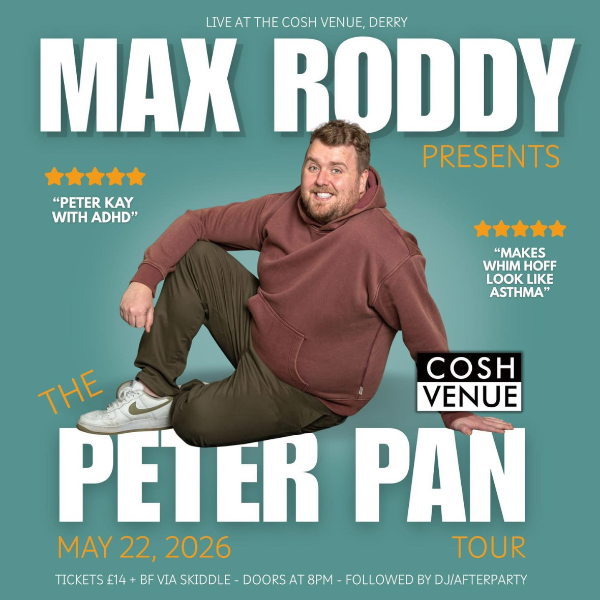 Few are rising through the Irish comedic ranks like Northern Ireland's own Max Roddy, and this May, he brings his Peter Pan Tour to Derry - "a chaotic, childish and wildly unpredictable stand-up hour packed with manic energy and absurd twists."