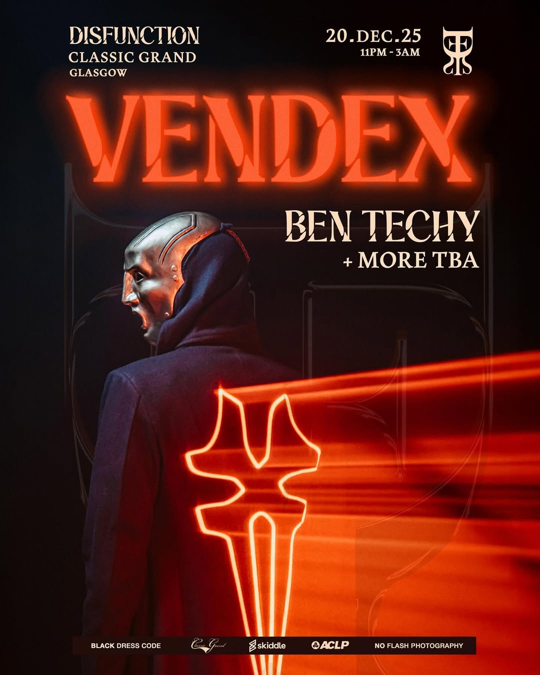 Final tickets are going for DISFUNCTION, who bring masked wizard Vendex and Scotland's own Ben Techy to The Classic Grand for groovy Schranz madness. Vendex’s first headline show in years, it’ll be massive.