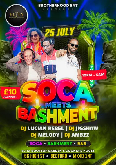 Expect a lively crowd, colourful fashion, and a party atmosphere that captures the true spirit of the Caribbean. From non-stop rhythms to unforgettable moments with friends, Soca Meets Bashment is more than just a party - it's a full cultural vibe.