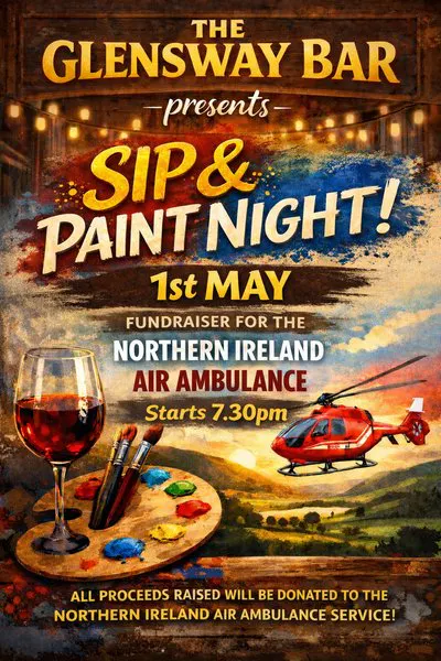 Hi Everyone, we are holding a Sip and Paint night in the Glensway on Friday 1st May 2026, all equipment supplied by the bar, All proceeds raised either by ticket sales and donations on the night will be donated to the Northern ireland air ambulance service which is vital for Northern ireland im sure we will all agree!