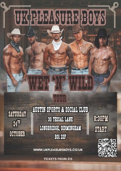 Get ready to ride into the wildest night of your life with the UK Pleasure Boys' Wet & Wild Western Style Strip Show - where cowboy boots meet bare chests and the saloon doors swing open to pure, unfiltered entertainment!