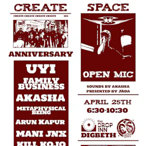 One year of Create Space. What started as a small idea has grown into a community, a platform, and a movement for artists across Birmingham. This anniversary night is about celebrating every performer, every moment, and every person who’s been part of the journey. Expect live music, rap, R&B, poetry, and the raw energy that defines Create Space. This isn’t just another event, it’s a reflection of how far we’ve come and a statement of where we’re going.