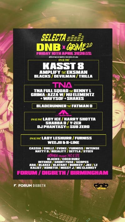 After a run of sold-out sessions, SELECTA: DNB x GRIME 2.0 lands in Birmingham for a no-nonsense clash of two UK heavyweight cultures.