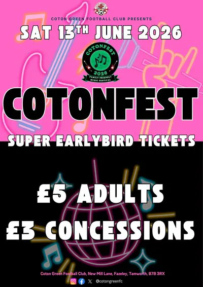 📢 Get Involved: Want to perform, volunteer, or showcase your products at CotonFest 2026? Please contact Aaron from Coton Green FC on 07894 575263.