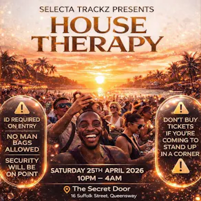 House Therapy isn’t just a rave — it’s a full reset for the soul. A night where deep basslines meet pure energy and the dancefloor becomes therapy. Curated by Selecta Trackz, this is where real house heads gather for one unforgettable journey.