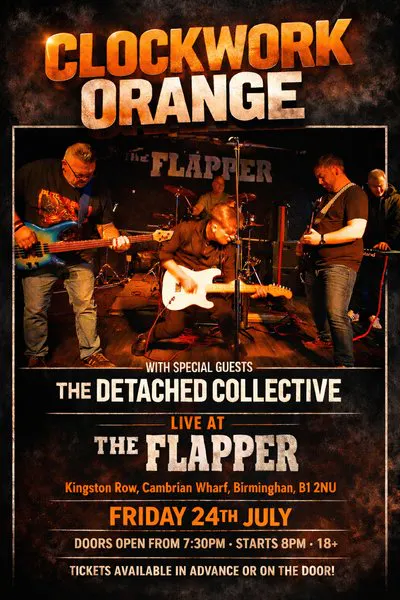 Two of Birminghams finest Indie bands Clockwork Orange & The Detached collective return to their hometown for a one off show at The Flapper on Friday 24th July.