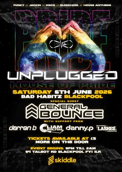 Unplugged events present the House of Pride a Night of Funky Jacking Disco Oldskool House Anthems And Throwbacks With Special Guest General Bounce Supported By Liam Bolton Danny P Lashes And Darren B