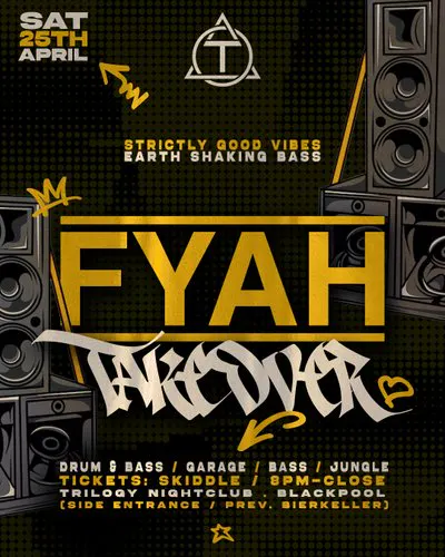 FYAH Takeover at Trilogy Nightclub. Blackpool. An evening of Good Vibes & Earth Shaking Bass. Expect the sounds of Garage, Drum & Bass, Jungle + more.