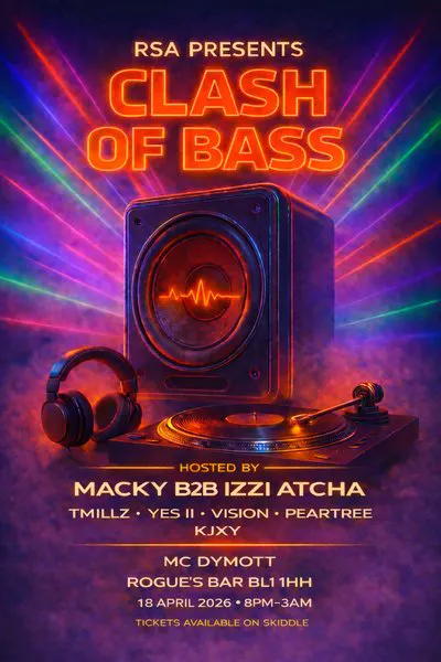 Get ready for an electrifying night of bounce and bassline as Clash of Bass takes over with pounding low-end, razor-sharp rhythms and nonstop energy. Expect laser-lit visuals, heavy drops and a stacked lineup delivering pure underground sound from start to finish. From bouncy grooves to bass-driven anthems, this is a rave built for movement, sweat and hands-in-the-air moments. Whether you’re a dedicated bass head or just chasing the ultimate night out, this event promises big vibes, big sound and unforgettable atmosphere. Bring the energy, feel the bass and experience a night that doesn’t let up until the last beat drops.