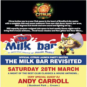 The Milk Bar Revisited invites you to the launch of Citrus Bradfords newest bar and club venue which will be dedicated to House anthems Club Classics Funky House and Disco edits .. Putting House Music Back in Bradford..
