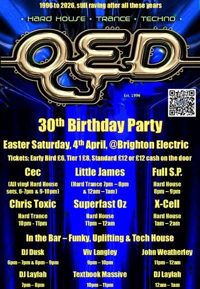 QED has been bringing Hard House, Trance and Techno to Brighton's club scene since 1996, which means 2026 is our 30th year, so we're having a birthday party over the best weekend of the year, Easter!