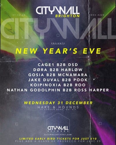 8 hours of non-stop b2b techno this New Year's Eve with Brighton's City Wall Records upstairs at Hare & Hounds.