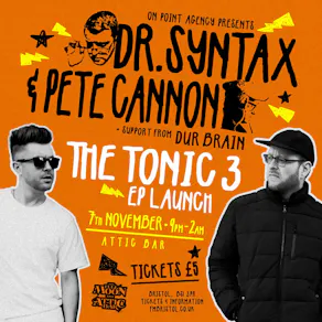 Legendary British hip hop duo Dr Syntax & Pete Cannon are back once again with their new EP 'The Tonic 3', and a raucous live show featuring music from over a decade of working together.