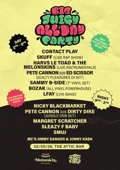 Dirty Dike & Pete Cannon bring Melonskin Records to Bristol for an all day, all night mega knees up. Live PA's, world exclusives, all the best DJs, interactive experiences to bring you joy, mega merch and much, much more.