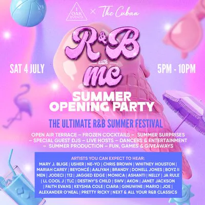 We're taking things outside and transforming the venue into a full-scale Open Air R&B Festival - sunshine, special guest DJ & hosts, frozen cocktails, terrace bar, production, live entertainment, terrace energy, and nothing but pure vibes all day long.