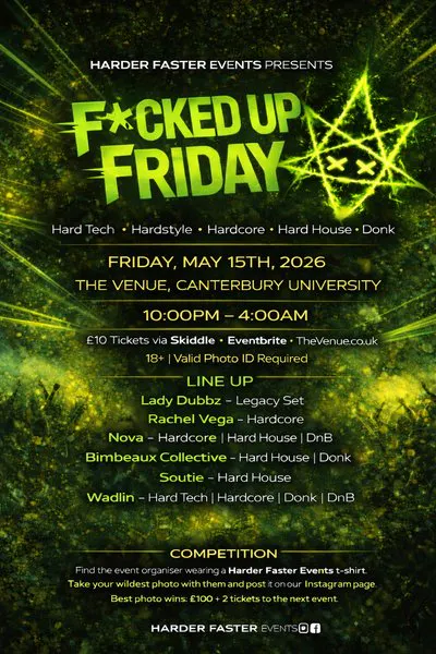 We're taking over Canterbury Uni for a night focused on hard, fast dance music. Expect a mix of Hard Tech, Hardcore, Hard House, Donk, and DnB, with a lineup built to keep the energy consistent from start to finish.