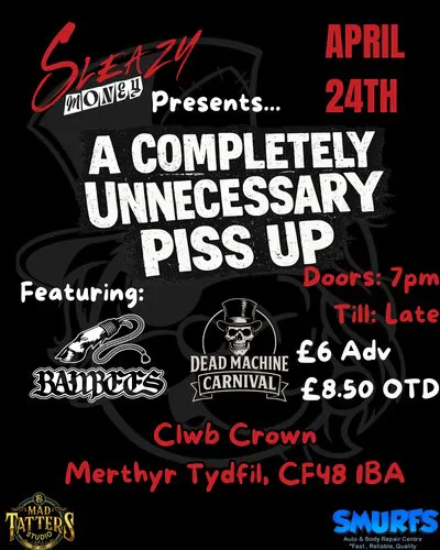 Sleazy Money are bringing back they're signature brand of party. If you were at the XXX-MAS BASH then you'll know what kind of night this is set to be! We'll gave games, giveaways, prizes and most of all, a night full of kick ass music! As usual, Sleazy Money bring the bargains with low ticket prices and high standards, this is shaping up to be our best gig yet! With support from the fantastic BAMBEES, Dead Machine Carnival and our good friends The Burlywhirls! Sponsored by Smurf's Auto & Body Repair Centre and Mad Tatters Tattoo Studio!