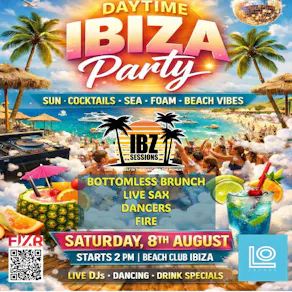 So picture this! Brunch booked or turn up later for the evening event! The best music IBZ style, cold cocktails, amazing dancers, sexy sax, foam (if you want it!) and fire, all accompanied with friends in the bay on a hot August Saturday!