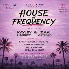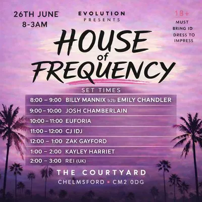 House of Frequency arrives in Chelmsford for a night dedicated to pure house energy, bringing together a standout lineup, immersive lighting, and an electric crowd from start to finish.