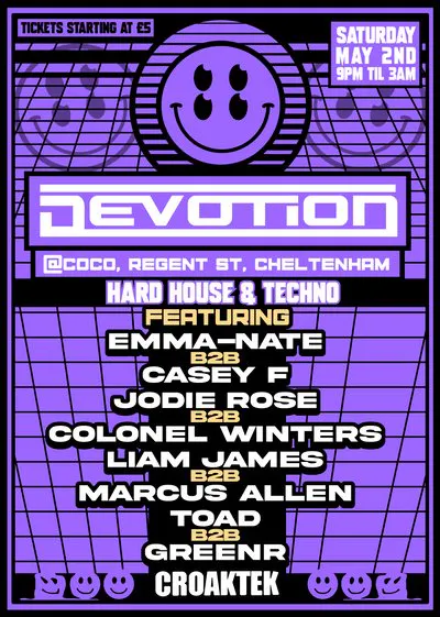 The late 90s marked one of the greatest eras in club culture — the birth of Hard House. At Devotion, we’re stepping back into that energy to reignite your passion for pounding basslines and driving 303s.