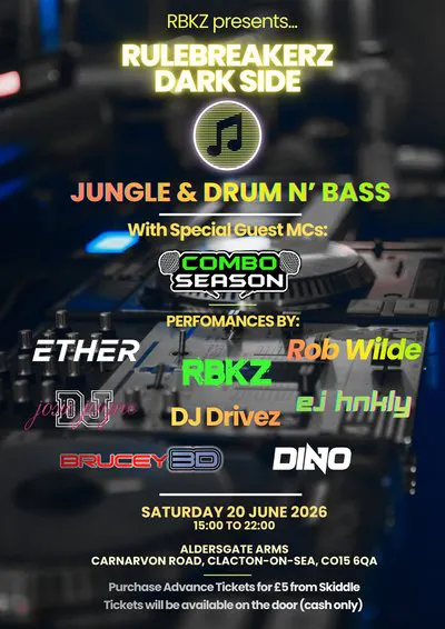 Rulebreakerz bringing you their first local drum n bass/jungle rave. Starting at 3pm & finishing at 10pm. 7 hours of drum n bass raving, finishing just intime to catch last train home!