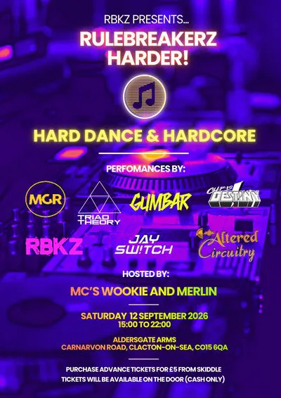 Rulebreakerz are bringing you their first local HardDance/Hardcore rave. Starting at 3pm & finishing at 10pm. 7 hours of raving & finishing just intime to catch last train home!