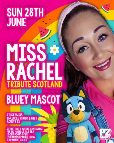 A high-energy, family friendly event featuring Miss Rachel Tribute Scotland & a Bluey mascot appearance.