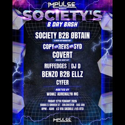 We're going all out for Society's birthday and you're invited to a full-throttle Drum & Bass rave at Babas Bar, Colchester.