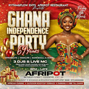 🔥🇬🇭 COVENTRY, ARE YOU READY?! 🇬🇭🔥 Ghana @69 is loading… and Afripot Restaurant & Rooftop Lounge is turning 6th & 7th March into a FULL WEEKEND SHUTDOWN! 🎉✨