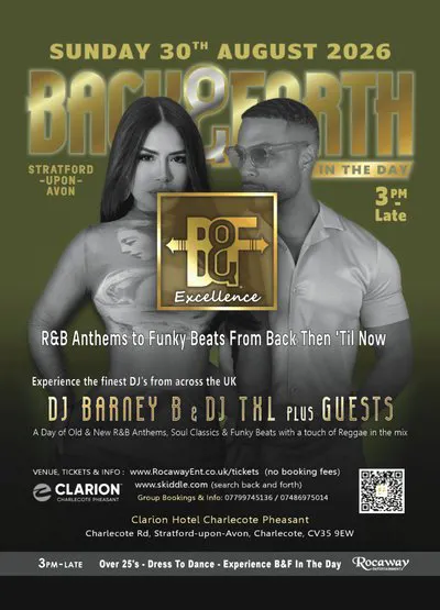 Back & Forth presents Day Time Club Event to be held at the Luxurious charming countryside location of The Clarion Hotel Charlecote Pheasant in Stratford upon Avon with musical entertainment supplied by Back & Forth resident Dj Barney B & DJ TXL plus guest dj's playing the best in Rnb, Soul, Reggae, Funky Grooves and Club Classics from 3pm-late