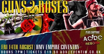 Guns 2 Roses, the UKs longest-running and most internationally recognised Guns N Roses tribute band, hit the HMV Empire in Coventry on August 14th. Formed in 2002, theyre the only GNR tribute to have toured the world and shared stages with members of Guns N Roses. Expect an explosive, authentic show packed with iconic hits and stunning attention to detail. This is as close to the real thing as it gets. Plus support from ACDC Reborn