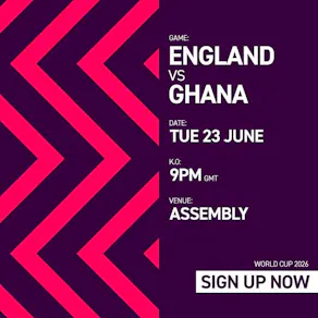 ![ENGLAND VS GHANA Tues 23/06/26 FANZONE [SIGN UP NOW]](https://skiddle.imgix.net/1/9/0/2185793_c644cdc2_england-vs-ghana-tuesday-23-06-26-ko-9pm_1024.jpg?auto=format%2Ccompress&width=auto&height=292)