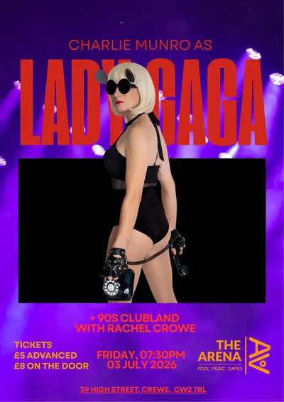 Get ready for a high-octane Friday night at Crewe's premier venue for pool, music, and games! We are bringing the "Joanne" and "Chromatica" energy straight to the heart of Cheshire with a breathtaking performance by Charlie Munro as Lady Gaga. Expect stunning vocals, iconic choreography, and all the hits from 'Just Dance' to 'Rain On Me.'