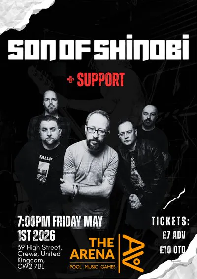 "Foo Fighters with balls" isn't just a quote; it's a promise. On Friday, May 1st, The Arena welcomes Son of Shinobi for a night of unrelenting energy and heavy rock mastery. Drawing comparisons to the giants of the genre while carving out their own gritty, melodic path, the band is set to deliver a setlist that "Dave Grohl himself would be proud of."
