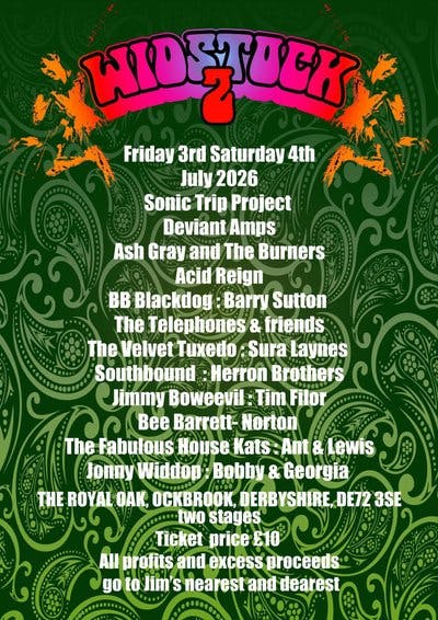Our line up includes: Sonic Trip Project, Deviant Amps ,Ash Gray And The Burners, Acid Reign, BB Blackdog, Barry Sutton, The Telephones, The Velvet Tuxedo, Sura Laynes, The Herron Brothers, Southbound, Jimmy Boweevil, Tim Filor, Bee Barrett - Norton, The Fabulous House Kats, Ant & Lewis, Bobby & Georgia, Jonny Widdop.