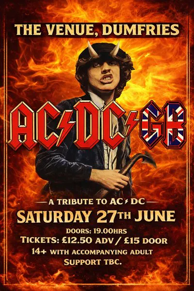 Get ready to be Thunderstruck because AC/DC GB, the UKs premier tribute to the legendary rock band AC/DC, are about to hit The Venue , Dumfries with their electrifying performance!!